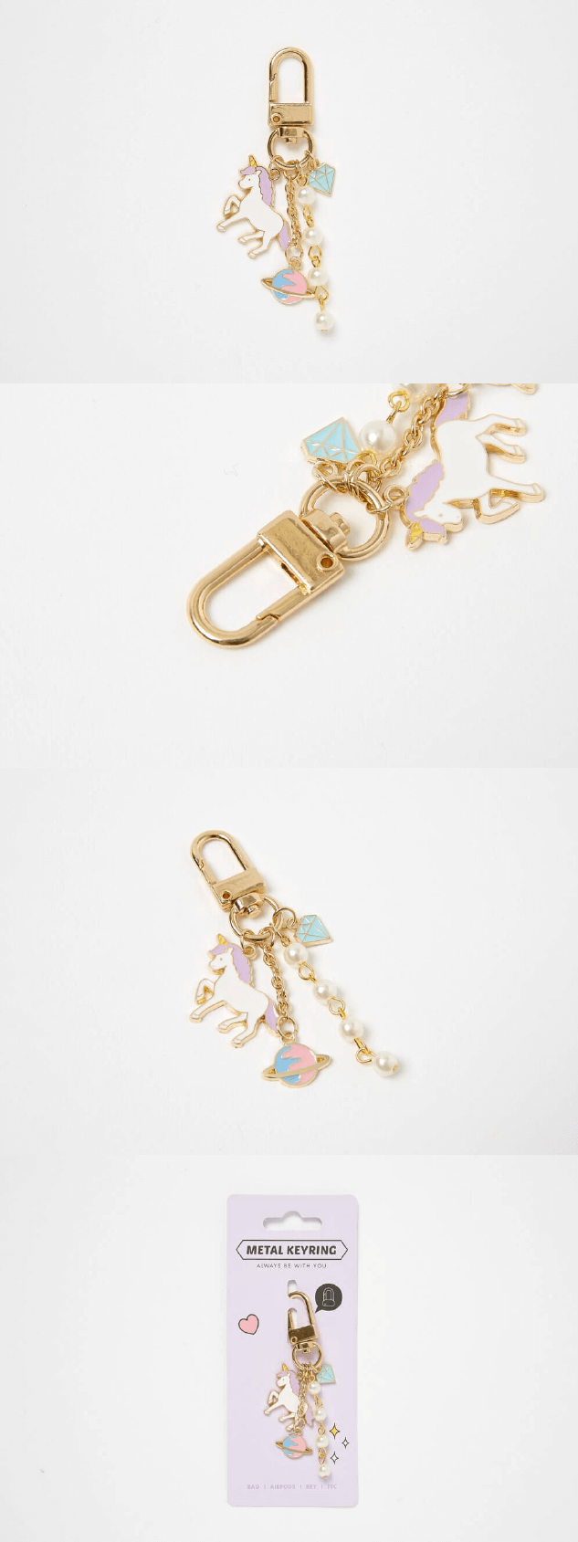 Te invitamos a darle un toque tierno a tu outfit con este lindo llavero. Posee un gancho metálico y pequeños adornos dentro de un círculo...